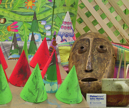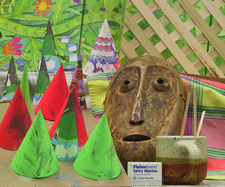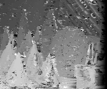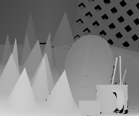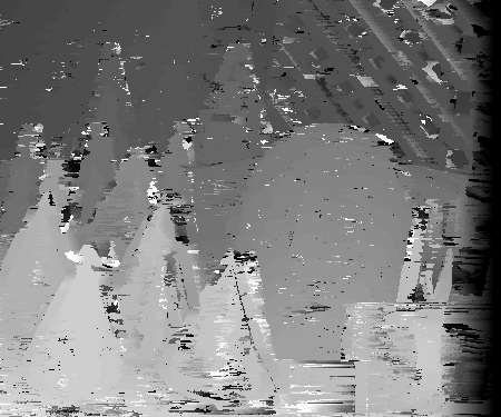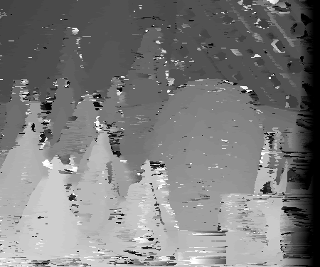 For diffusion, I used a neighborhood size of 1 for my visualizations. Doing this seemed to improve results. Before, using the standard SSD algorithm with a neighborhood size of 1, there were many instances in which the disparities were erratically found. Because there were many possible matches, the disparties amongst similar pixels of the same object at the same depth sometimes appeared to have different disparity values. Some examples of this include pixels of similar intensities and minimal textured differences like small patches being looked for in seemingly non-textured parts of the mask and cones. The disparity space slice shows instances in which parts of the mask have many disparities with low SSD values comparing to the non-reference image. Diffusion helps cover-up these areas by spreading the disparity values in a sense of a point to its neighbors. By performing this many times, one can spread good, consistant neighbor values to a pixel that is most likely an anomaly. As diffusion occurs, one can observe the "diffusion" of "good" data throughout the image in both the disparity space slices and the disparity images. After 10 iterations, the diffusion appears to do a good job correcting anomalies inside of various objects. This is because the neighboring pixels of the anomalies have similar minimum SSD scores at the same disparity. Diffusion will enable the anomalies to eventually converge to have minimum SSD values around the neighboring disparity values. However, this diffusion technique does not work well for disparity edges. Because neighboring pixels have differing disparity locations for the minimum SSD values, these multiple disparity values will be reflected on the edges after diffusion. This blurs or smudges the outline of the objects being viewed. For example, the cones in the final disparity image for diffusion appear to no longer be cone shaped but have smudged edges.