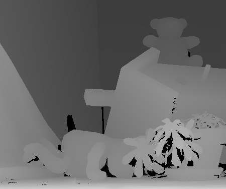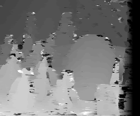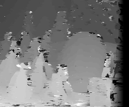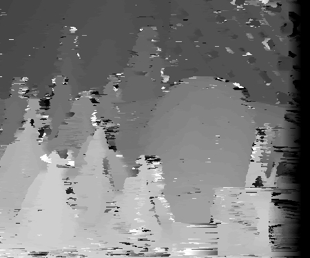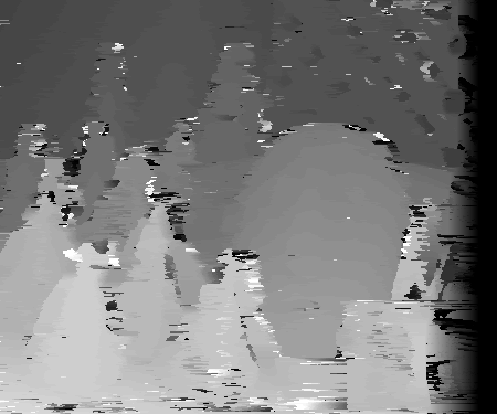 Incorporating a notion of certainty improves the quality of the matches at some pixels. This method is particularly well at not performing diffusion at the areas between disparity borders. This is because, as evident by the graph plot above, pixels at this region have a higher winner margin and other pixels. This is because of reasons stated earlier. One can observe the "light" SSD values in the disparity space slices not diffusing at these certain locations. The selective diffusion is more likely to perform diffusion on anomalies mentioned earlier in the previous section inside of objects of roughly the intensity or texture composition. However, this selective method, because of its checks and possible difficulty in computing the "true" winner margin based on intensity differences and other factors, does not as aggressively diffuse. This leads to some anomalies with a relatively large winner margin to not be diffused. This could be because the program compares the certainty of the winner margin before and after diffusion is applied and not to a universal threshold. Therefore, to escape diffuse, the winner margin of a pixel only needs to be greater than its new winner margin after diffusion was applied. Pixels near the edge seem to be more likely to diffused as well due to increased difficulty trying to find the disparity was one approaches the border or limit of the edges used. Some parts of the right edge of the right image are not in the left image, making the disparity to be unknown for this area. This could allow for diffusion in the selected case to occur.