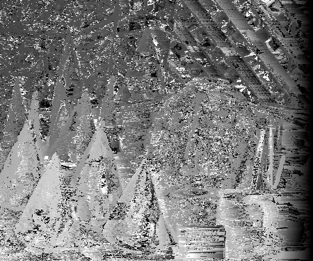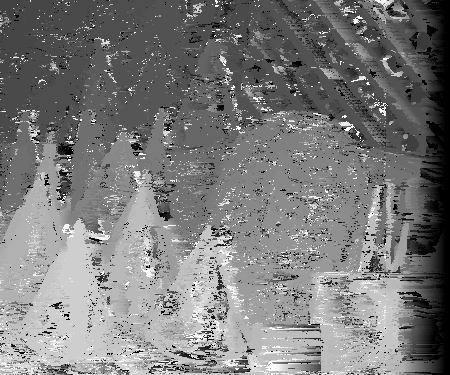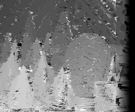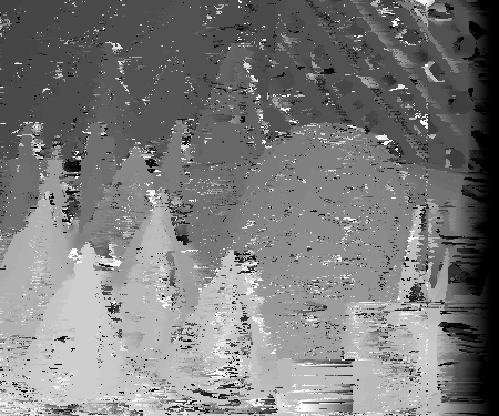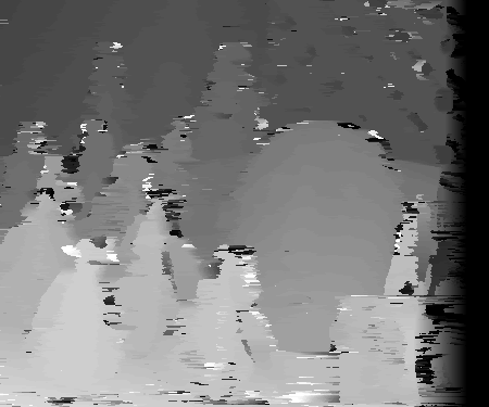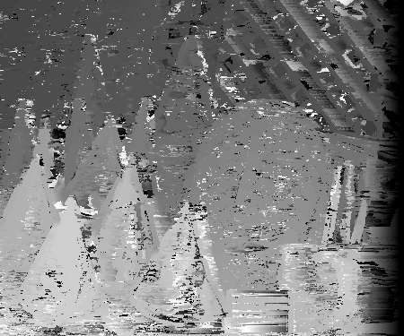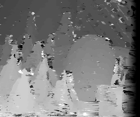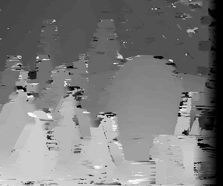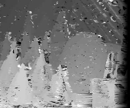 However, finding the correct disparities could be hindered by many factors. One of these factors is occlusion. Consider the wooden mask behind the green cone in the third segment. At different view angles, different parts of the mask will show or not show behind the green cone. In the non-reference image, part of mask visible in the reference image is now blocked by the cone in the foreground. Therefore, there will be much difficulty in matching these pixels to the non-reference image since the non-reference image won't include these pixels. It is difficult to estimate the correct disparity at certain texture-less areas. Because there is no texture, there is difficulty is matching which pixel in the area corresponds to its correct match in the non-reference image. If the pixels are texture-less and appear to have the same intensity, multiple matches could be found. This is apparent in the disparity space slices where there are large dark diamonds. The same may be true for reflective surfaces. Depending which way rays are reflected on them, these surfaces could appear to be different in different pictures. This would make it very difficult to find a window match in the two images among different disparities. However, finding the correct disparity should be easiest when dealing with textured areas across many depths with minimal occulsion as evident by many of the disparity space slices shown above. Below are some more disparity space slices that exhibit similar characteristics for the teddy data set.