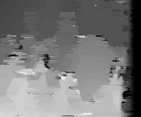 For each pixel location in the disparity space, find the minimum sum of squared difference for each disparity. Whereever this minimum occurs indicates the window of pixels shifted over by that disparity in the non-reference image agreed the best with the window of pixels in the reference image. Store this disparity value for that pixel location. This indicates that at position (x,y), the disparity between the object in the reference image and the same object in the non-reference image is the stored value. Once these minimum difference disparities are found and stored in a matrix, the program normalizes this matrix and converts it into a grayscale image. This produces a stereo reconstruction image in which the objects in the scene are shaded based on their position in the depth of field. Objects that are deeper in the field of view will appear to not move as much between two images. Therefore, these objects will have a better agreement at a smaller disparity and will thus appear to be more black in the reconstructed image illustrating depth. Objects that are closer in the field will apear te move more between the left and right images. Therefore, these objects will have a better agreement at a larger disparity and will thus appear to be lighter in the reconstructed image illustrating depth. The following illustrate the disparity space visualizations using the first strip in the first part of the assignment and the resulting depth images using the normal SSD technique of various window sizes.