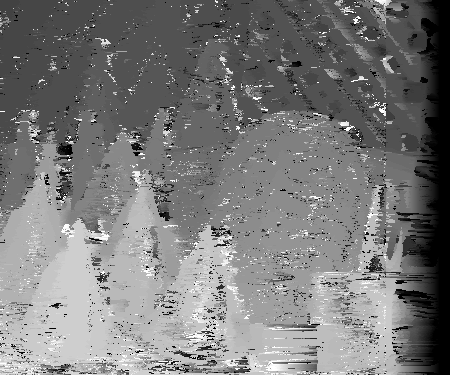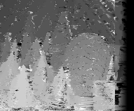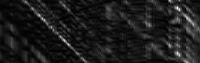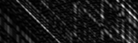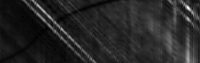 Now that the program has the 200 pixel strips in which the user wants to visualize the disparity space for, the disparity space for each segment can now be calculated. For each strip, perform the following process. For every 200 pixels in the strip in the reference image, grab the corresponding pixels in the non-reference image. At first, shift over the strip window by one pixel. This corresponds to a disparity of one. Now calcualte the intensity difference between each pixel in the reference image and its corresponding shifted pixel being looked at in the non-reference image. Store these values for each pixel in the strip for the corresponding disparity just looked at. Continue this process for each disparity to shift the strip window in the non-reference image by until the program either reaches the maximum disparity being considered (in this assignment, I will assume this to be 63 pixels) or until the shift window reaches the border of the non-reference image. As a result, you should have a 63x200 matrix of intensity differences: each pixel in the reference strip is compared against a similar sized window in the non-reference image at least 63 times. This number of times corresponds to the amount the window in the non-reference image being compared to is shifted over. In the end for each x value in the image and each possibly disparity being considered, there will be an intensity difference calculated. I took this 63x200 matrix, normalized it, and displayed it as a grayscale image. Points of good agreement are thus more black while points of poor agreement are more white. For better comprehension on my part, I decided to make the bottom row of the visualization to represent a disparity of 1 while the top row represented a disparity of 63, or the max possible disparity. The following are various disparity spaces visualized for selected horizontal 200 pixel strips in the images provided.