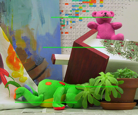 To complete the stereo matching algorithms, I decided implemented a main function in matlab called stereoSSD.m with seven parameters: dir, lFile, rFile, nSize, setting,, Px, and Py. dir is the directory in which you want to work in. The program assumes that this directory exists for simplicity's sake. lFile and rFile are the two image files you want to perform stereo matching between. These files are assumed to be in the directory dir. lFile is the image taken with the field of view shifted to the left while rFile is the image's field of view is shifted to the right. For ease of use and understanding, the program assumes that each file is valid. In order to perform stereo matching, these two images should be of roughly the same scene which the field of view shifted to the right in the right image. nSize is the window size used when computing intensity differences at each pixel. setting determines which algorithm for stereo matching the user wants to perform. When setting is 0, the program performs the standard "sum-of-squares" algorithm for a range of window sizes. When setting is 1, the program performs the "membrane model" algorithm for a range of window sizes. When setting is 2, the program performs diffusion with local stopping criteria. Px is an array of x coordinates of the starting positions of the horizontal 200 pixel strips the program wants to visualize the 2D disparity space slice for. Py is an array of y coordinates of the starting positions of the horizontal 200 pixel strips the program wants to visualize the 2D disparity space slice for. Px and Py are assumed to have the same size. The i-th element in Px corresponds to the i-th element in Py. For the i-th horizontal 200 pixel strip, the starting coordinate is (Px(i),Py(i)).