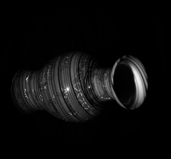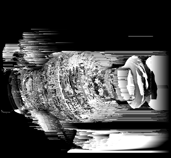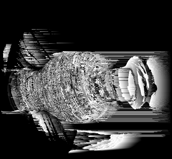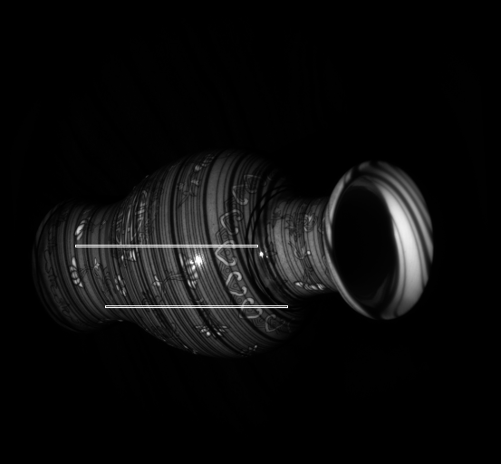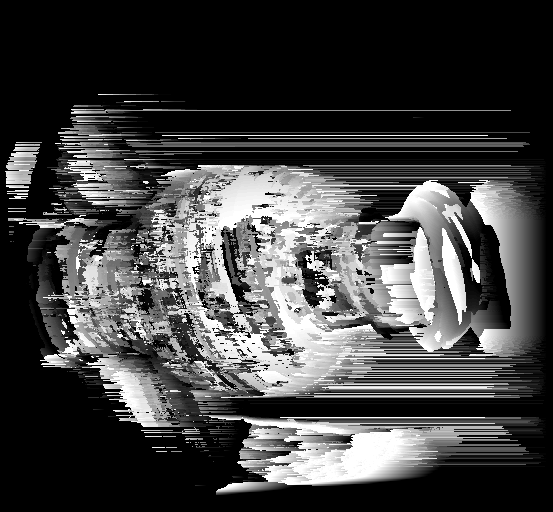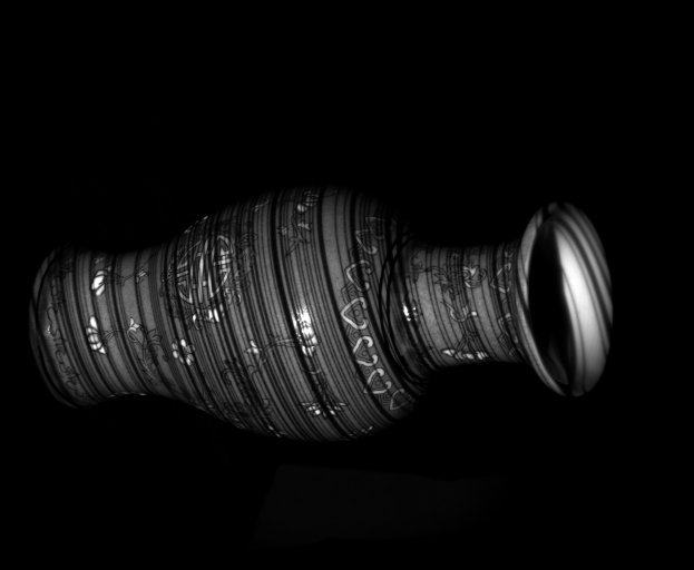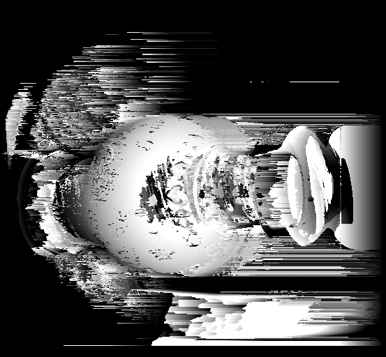As one can see the accuracy definitely improved using the space-time technique. At different time intervals, different light patterns were shown on the vase. This allowed for each pixel on the vase to have a sort of unique identifying signature. This allowed for better results when trying to match a group of pixels from the reference image to those in the non-reference image. The various lines allowed for the surface of the vase to appear to be more solid unlike in the estimate using one frame in which the surface appeared to not be smooth but be of different depths. However, both techniques run into problems of trying to estimate the depths of the art on the vase. This could be because the black lines might interfere with the displayed line signature at each point. Therefore, this might cause other disparity values besides the accepted value to have the minimal SSD score in disparity space as seen in the disparity space 2D slice of the first segment. Areas with art lines appear to have a larger "dark" area indicating small SSD values there. In addition, each technique has problems identifying the depth of the background. Random white lines appear next the vase, possibly due to intensity different at locations in the two pictures being comapred at a time.