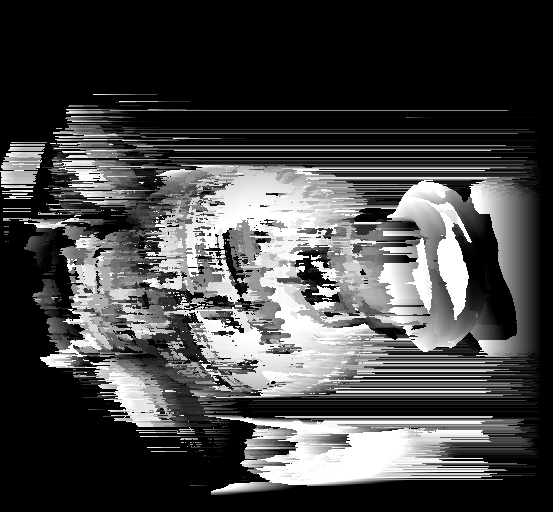 Much of this function is the same as the previous stereo matching implementation. However, there is an additional iterative loop over calculating the SSD values for each position in the three dimensional disparity space matrix. In this loop, the program loads sequential frames from the directory and calculates the SSD scores for each position in disparity space. These values are added to the sum of previous SSD scores. The final sum of SSD scores represents the SSD values over a temporal period. For performing diffusion and selected diffusion, see the notes on implementation from the previous section. Below is an example of disparity space from two segments taken from the first frames of the vase data. To generate these visualizations, I used my function written for the first section of this assignment.