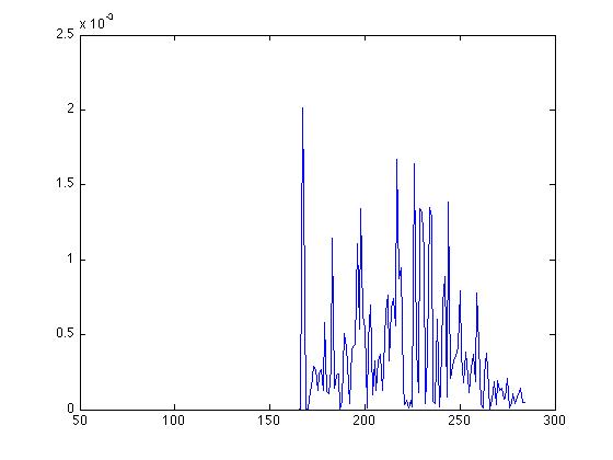 For selection of two 200 pixel strips to visualize the disparity space for, I used my previous program for section 1. For the diffusion with local stopping criteria algorithm, I had a parameter in my stereo reconstruction program to enable diffusison with local stopping criteria. First, the program calculated the disparity space for the two images like previously mentioned in the standard sum of squared difference algorithm. Next, perform diffusion with local stopping criteria for a certain number of iterations. In this example, the number of iterations is hard coded to be 10 to conform with what is asked for in the assignment. To perform this algorithm, we need to be albe to calculate a matrix of "winner margins" for each x,y coordinate being considered in the disparity space. For each x,y coordinate, find the two lowest SSD scores amongst the valid disparities. Find the difference between the second lowest value and the lowest value. Divide this value by the sum of differences amongst all disparity values. Now, the program is able to perform diffusion with local stopping criteria. First, find the winner margin values using the current three-dimensional disparity space. Make a copy of the current disparity space being made. To do this, I made a zero matrix of the same size and copied over the original matrix element by element. While this uses more memory, it takes a shorter amount of time to update each element in a matrix of a constant size than to continually try to build a matrix of increasing size. Next, perform diffusion on the disparity space as mentioned before, overwritting the old disparity space. Now calculate the winner margin values for each pixel in the new disparity space. Compare the normalized winner margin values before diffusion with those after diffusion. If the winner margin was greater in the ones before diffusion, restore the SSD values for each disparity at that point. Continue doing this for however many iterations specified. The following are visualizations of the certainty using the same first horizontal 200 pixel strip as mentioned earlier before and after applying the intial diffusion for various numbers of iterations. In addtion, there are visualizations of the final depth reconstruction images after applying selective diffusion based on local stopping criteria. To visualize the winner margin values, I plotted the winner margin values for the x values in the first segment