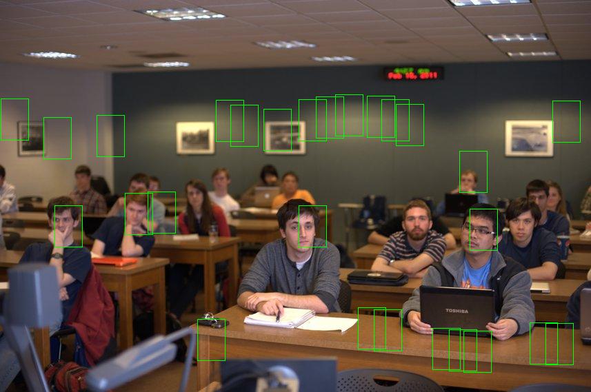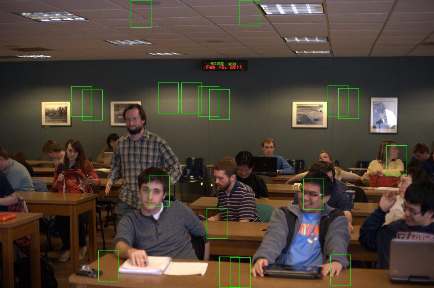 As you can see, the face detector detected many false positives in its search. These false positives seemed to occur in three general areas: lighting hitting the padded wall, the ceiling tiles, and the wood of the desks. This is most likely because these areas are somewhat skin colored. When looking for a scaled down template in a target image, some of details of the template are lost. This loss of detail in the template would result in a more blurred average face with less recognizable facial features. Therefore, when looking for a face this way, the more 'skin colored' and blurred objects will be wrongly identified as a face. There are some false negatives returned as well. It was able to detect many of the students' faces when they are facing forward. This is because we only use one average face template which is directly looking at the camera. This algorithm makes it nearly impossible to detect faces that are not straight on.