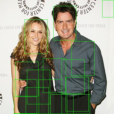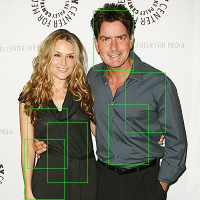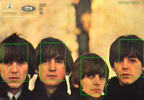 My face detector did somewhat well when applied to images of people not in our class and used in constructing the average face. Using the correct scales and thresholds, I was able to detect all four members of the Beatles in 'beatles.jpg' and Charlie Sheen's face in 'sheen.jpg.' The detected face was centered almost between each person's eyes. The minimal SSD/"face points" image indicated the same result. However, the program did not do well at detecting faces in the last two input images. In 'sheen-with-girl.jpg', with a relatively low threshold, the program was able to identify Charlie Sheen's face but not that of his lady friend. In addition, the program returned many false positives, especially in Charlie's suit. Raising the threshold allowed for the girl's face to be detected.