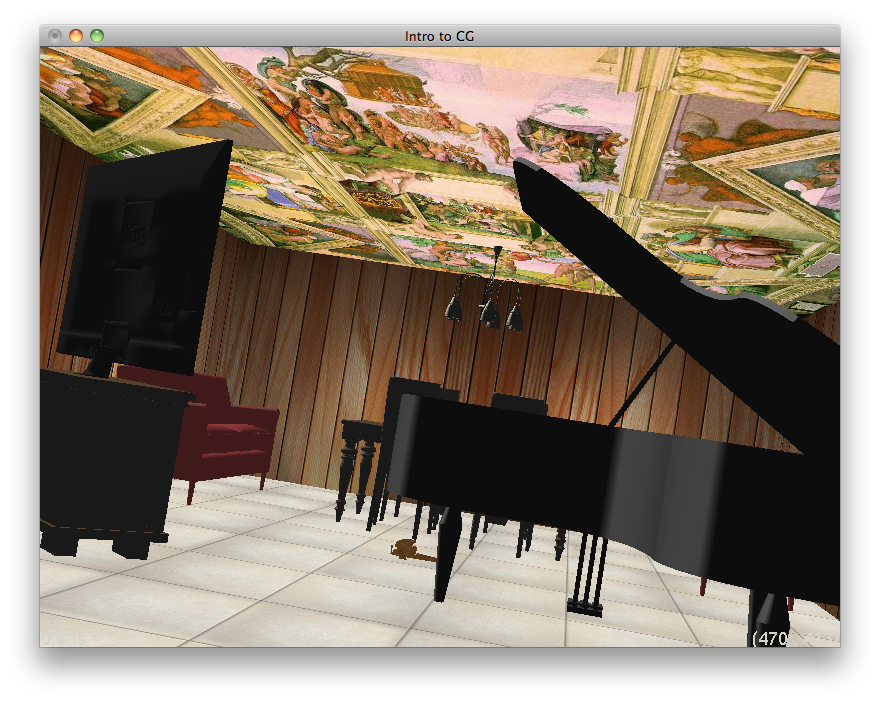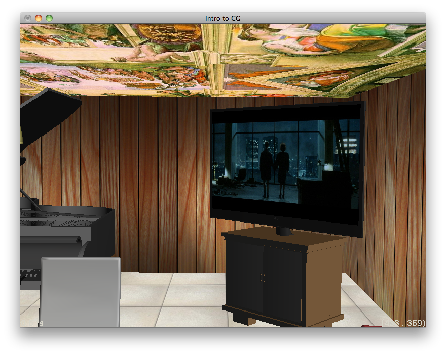 The room scene can be found in room.ray. I first made a room made from planes. These six planes faced inwards and became the floor, ceiling, and walls. I then populated the seen with objects I converted from .obj to .ray and changed their material properties. Some of these materials were a TV, a table, chairs, couches, a piano, a toy plane, a chandelier, a vase, and candles. I put a quadrilateral plane in front of the TV so I could texture it, making it appear like something was being watched. I textured the floor, ceiling, and walls with different textures as well. For each candle, I put a different colored point light source. To render the scene, you also need these ray files: dinner_table.ray, chair.ray, couch.ray, chandelier.ray, vase.ray, table_stand.ray, piano.ray, tv.ray, candle.ray, and toyplane.ray. You need the following images for textures as well: floor.jpg, ceiling.jpg, wall.jpg, planewood.jpg, and FightClub.jpg. The following were rendered with this command: