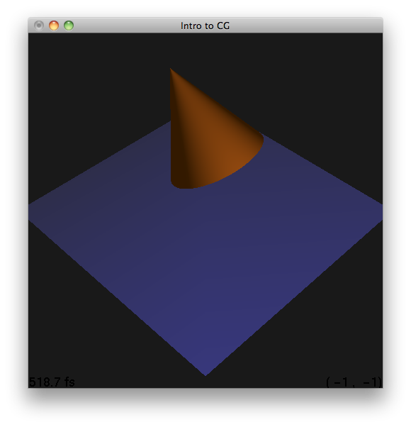 Figure 11.2 Scene with a cone centered at (0,.5,0) with radius 1, height 2 at complexity level 10. (test_cone.ray)
