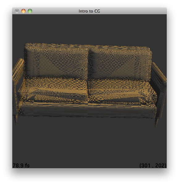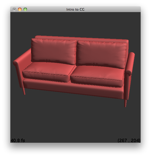 Figure 13.3 A couch converted from an .obj file to a .ray file. This is with only using the first three vertices of a face instead of splitting quadrilaterals into two triangles. The scene rendered is test_couch_triangle.ray.