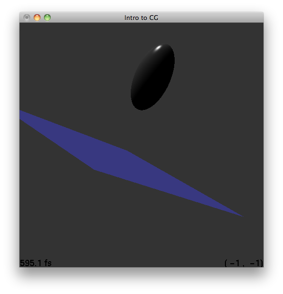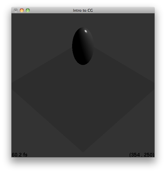 Point lights, like the name implies, originate at a point. Point lights can attenuate with distance from the origin. In Figure 5.1, the point light source is located at (5,1,0) and has no attenuation (1,0,0). One can see how the direction of the light affects the diffuse intensity computed from the plane. As you go more left (in the negative x axis), the angle between the light and the surface normal increases. This decreases the density of the light at that point, making the diffusion contribution less and less, almost creating a gradient. In Figure 5.2, attenuation is factored in (1,1,0). One can see that the light almost fails to reach the ellipsoid due to the attenuation. In addition, the specular highlight in Figure 5.2 is less than that in Figure 5.1. One can also observe how the diffuse, specular, emissive, and ambient material properties interact with the light.