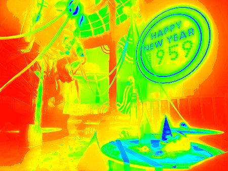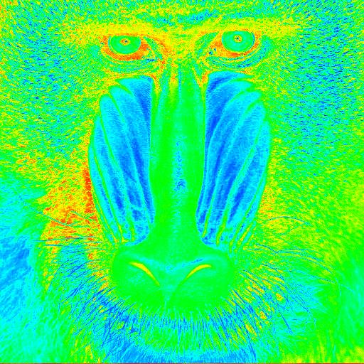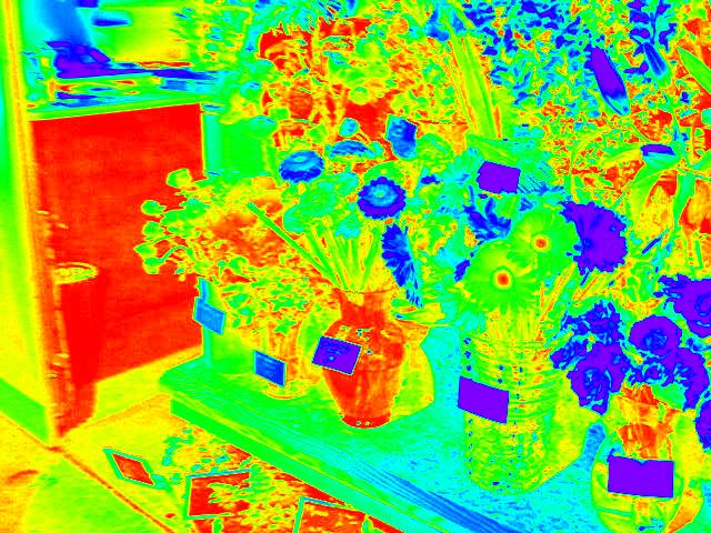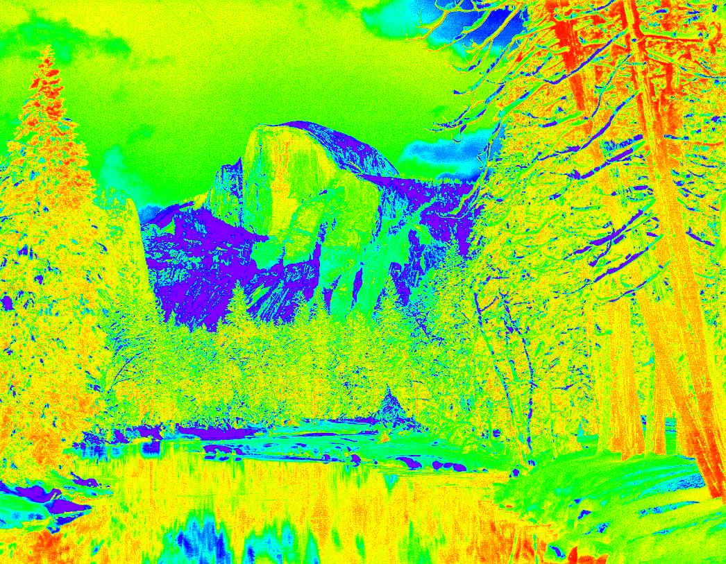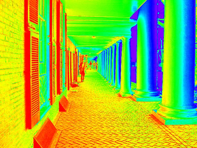 To test my function, I wrote a test function which would perform false color imaging on different input pictures. From the input image, I was able to create an intensity or grayscale image that was representitive of it. Therefore, each pixel in the image was now an intensity value between 0 and 1. For each pixel, I called my function to map its intensity value to a specific rgb color. I then set the pixels' rgb values to the rgb triple outputted by the color mapping function. As a result, given an image as input, I was able to create a new image with color corresponding to the input image's pixel intensity. Below are five examples of false colored images produced using my color mapping function. Again, red and orange values correspond to pixels with low intensity, yellow and green correspond to medium intensity, and blue and purple correspond to high intensity.