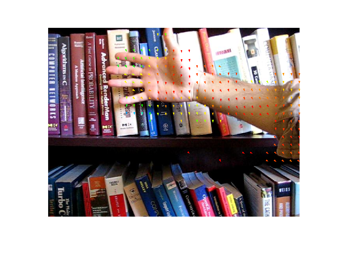The video of the hand has a static background of a bookcase. Within a couple of frames, a hand comes down from the top right of the frame and moves slowly down. As seen in my videos, I was able to detect the optical flow across this video. The motion vectors were all near the hand and pointed in the direction of motion. This strongly indicates that the hand was moving in the video with nothing else. In addition, the program picked up on the shadow of the hand, indicating its movement. There were some anomalies where arrows appeared where there was no movement. This could have been because of a slight light intensity change or noise in the scene from frame to frame. This was greatly expected since there was little intensity change between frames and the movement in the video trying to be detected was a simple translation. There were some interesting finds related to which vectors showed up near the hand. There seemed to be a lack of vectors on the forehand of the subject's hand throughout the video. This could be because of lack of variation in that patch of skin. Looking at the forearm, there are little to no unique marks the program could use to determine translated motion. However, the program could do this on other parts of the arm with somewhat unique markings such as lines on the fingers and palm of the hand. This increase in texture seems to help identify motion.