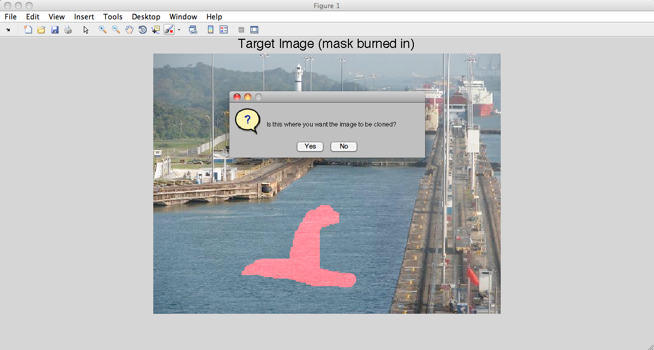 The program then displays the target image. The user clicks where he or she wants to seamlessly clone the source image on the target image. This clicked location corresponds to where the center of the selected source image will be on the target image. Our implementation of seamless cloning only works when all of the pixels of the cut source correspond one-to-one with a pixel in the target. Therefore, the program will not work if the cut source is placed in such a way on the target that some of the pixels in the cut source exceed the border of the target image. The cut source image cannot be bigger than the target image. If this occurs, the user is notified and asked to replace where he or she wants the source image on the target. If a valid placement is made, the function displays the target image with the pixels corresponding to the cut mask burned. It then asks the user if he or she wants to keep this positioning. If the user answers yes through a dialogue box, the program proceeds to seamless cloning. Else, the function asks the user to reposition where he or she wants the source on the target. A visualization of the positioning acceptance process is provided below. Once the positioning is accepted, the function cuts the target image to include the pixels in the target corresponding to the pixels in the cut source image as determined by the user. The function returns the matrix represenatations of the cut source, cut mask, and cut target images. Various representations of the mask images are saved in the "Masks" subdirectory. In addition, it returns the x and y positions on the target image where the top left corner of the cut source image corresponds to.