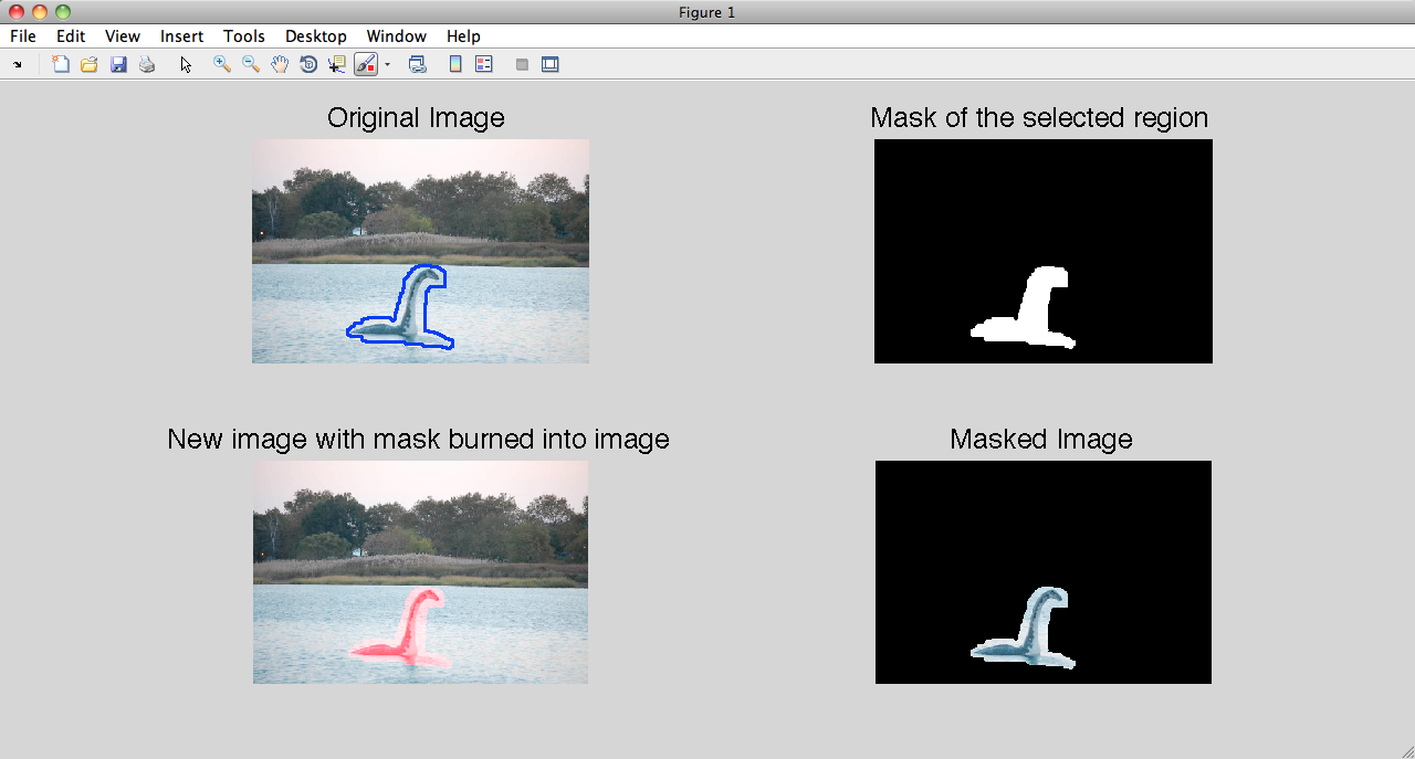 The selection of the source image that the user wants to seamlessly clone onto the target image and the location of where the user wants to perform the cloning need to be obtained. To do this process, selectiveCut.m was written. This piece of code was inspired by and based off of a previously implemented Matlab code for free-form selection located here. selectiveCut.m takes in two parameters: sFile and tFile. These are assumed to be the same first two inputs for runPoissom.m. The assumptions for the same inputs in runPoisson.m still hold true for the ones for selectiveCut.m. In this helper function, the source image is displayed. The user is asked to cut out a selection of the source image to seamlessly clone onto the target image. The user clicks and drags the mouse around the portion of the image they want to seamlessly clone, lassoing around the desired pixels. Upon completion of the selection, the program displays the original image, a binary mask of the selected region, a new image of the mask burned into the original image, and the masked image. An example of this visualization is provided below.